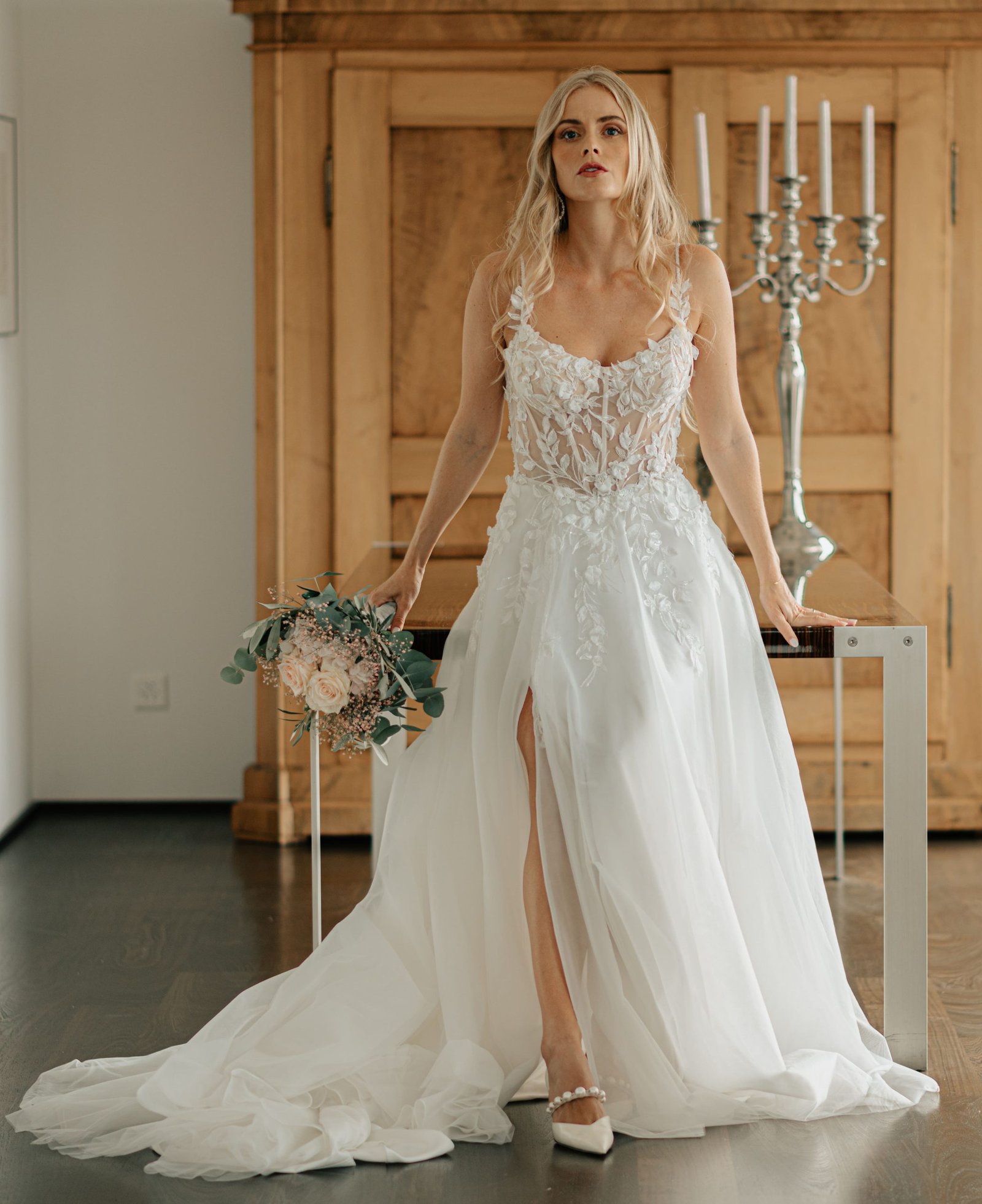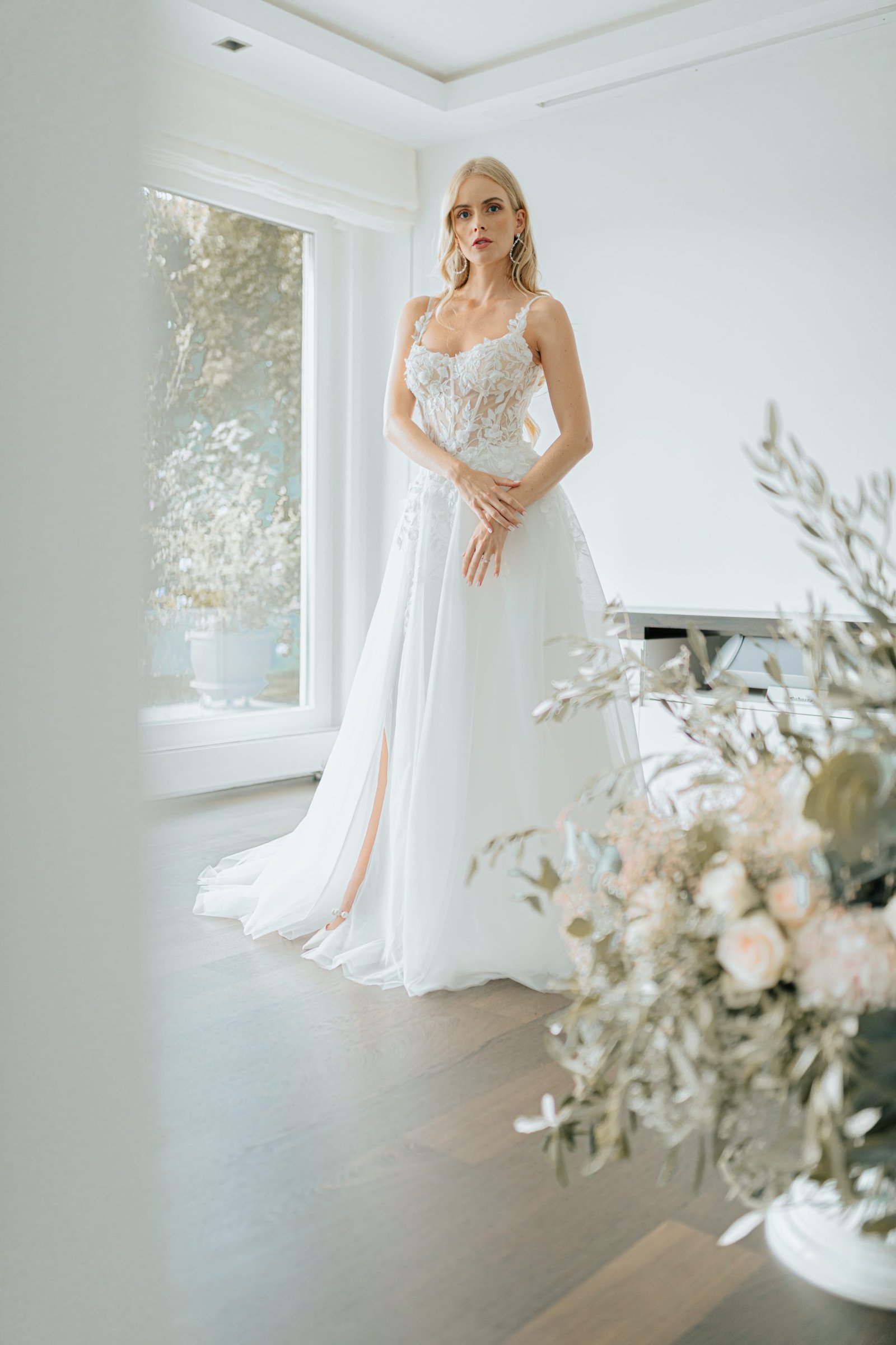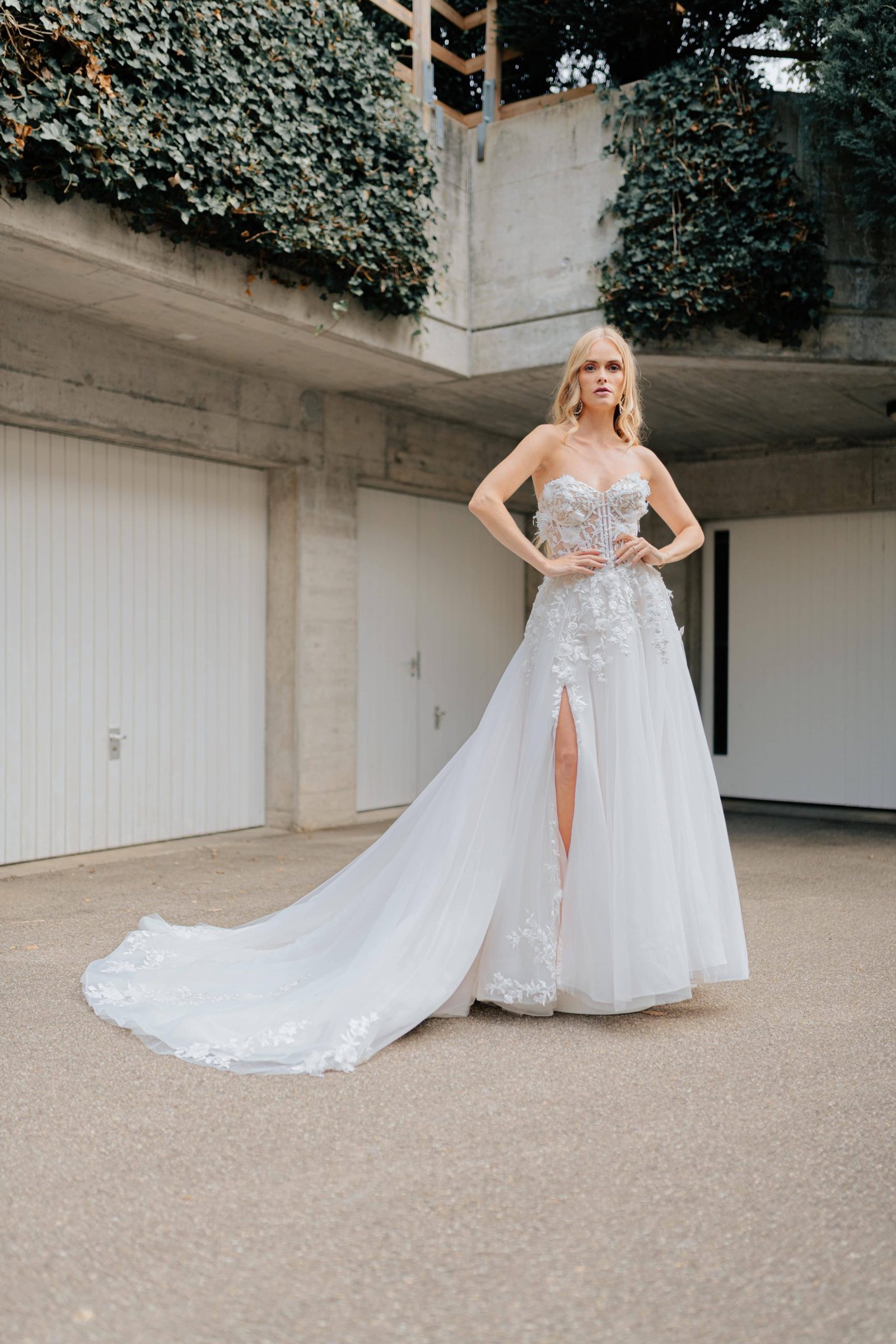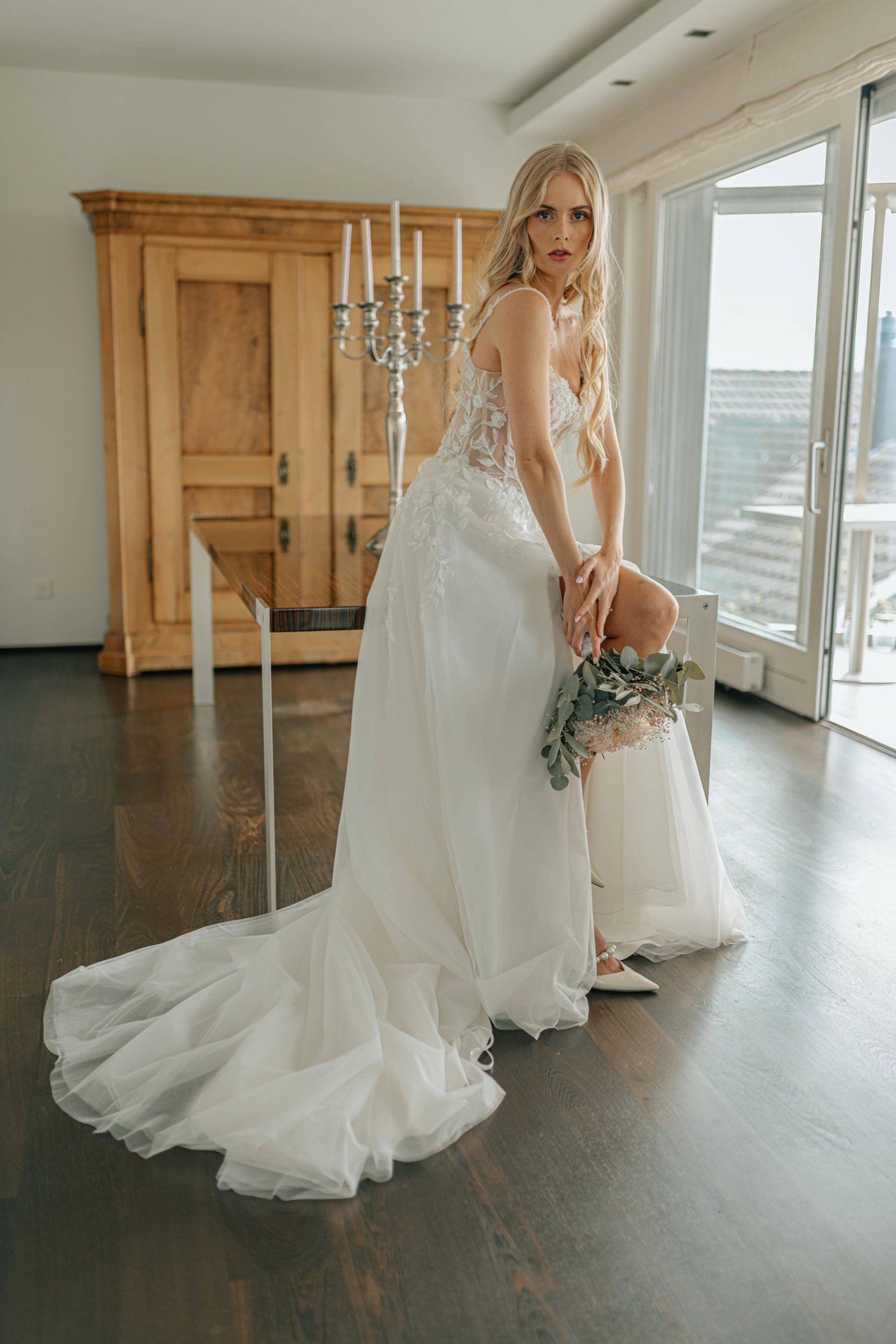 Das Kleid Amaranta ist eine Ode an Leichtigkeit und Raffinesse. Mit einer fließenden A-Linien-Silhouette schaffen die Tülllagen eine ätherische, feminine Atmosphäre.