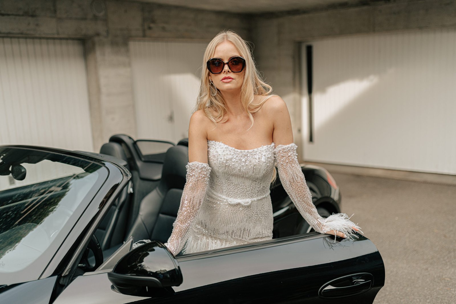 Der Rock, mit von Hand angenähten Federn am Saum und abnehmbaren Ärmeln als Ergänzung, macht Blaire zur idealen Wahl für Bräute, die einen einzigartigen Party-Look suchen.